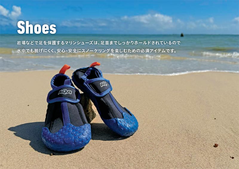 岩場などで足を保護するマリンシューズは、足首までしっかりホールドされているので水中でも脱げにくく、安心・安全にスノーケリングを楽しむための必須アイテムです。