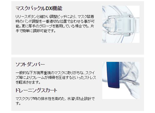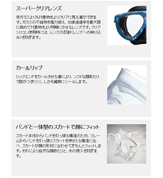 フィット感抜群のリークレスシステムを採用し、丸みを帯びた可愛らしいフォルムの一眼マスク大きめのレンズで表情がわかりやすく、スクーバダイビング・スキンダイビング時のアイコンタクトも取りやすいマスクです。