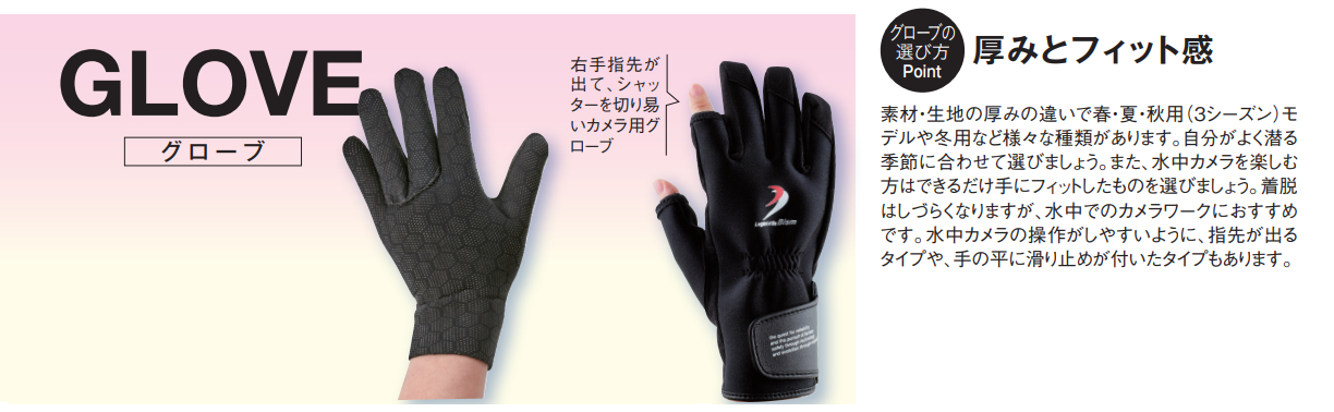 手の保護用スリーシーズングローブ、薄手の夏用サマーグローブ、保湿性の高い冬用ウインターグローブ、カメラ撮影向けカメラマングローブなどなど。