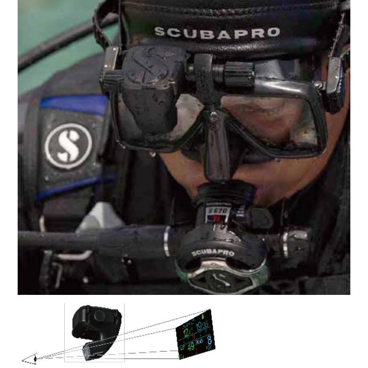 見かけは小さなディスプレイに見えますが、SCUBAPROの新しい「ニア アイ オプティクス技術」で約1メートル先に大型画面があるよ うな仮想表示され解読しやすいディスプレイです。