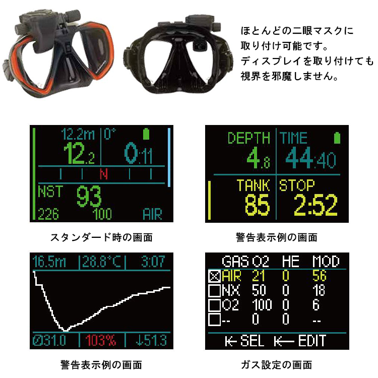従来の腕に取付けて使用するタイプのダイブコンピューターと違い、ハンズフリーでダイビング情報を確認できます!