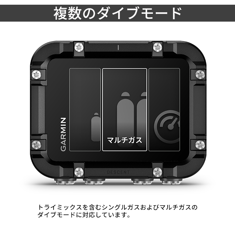 ダイビングコンピュータとタンク間は、トランスミッター(無線)でタンク残圧を監視しでき、マルチガスダイビングにも対応しています。