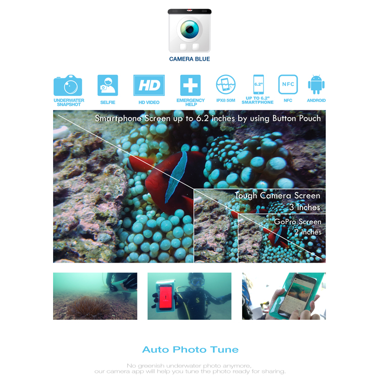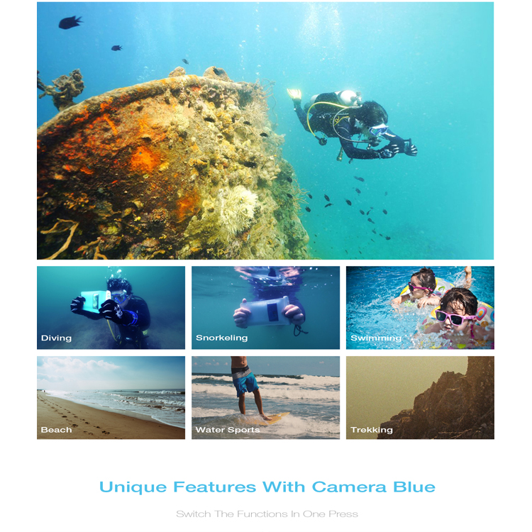 このハウジングは、ダイビング、シュノーケリング、サーフィン、スキー、その他アクティビティをする際に、スマートフォンを保護し、素晴らしい映像や写真を撮影することができます。撮影後には、いつでも簡単にSNSやクラウドにアップロードして、共有することができます。さらに撮影だけでなく、スマートフォンに内蔵されたコンパスは、水中でも利用できるので、安全性が高まります。