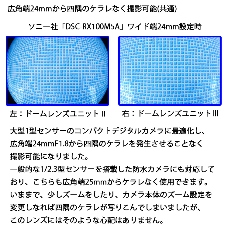 別売りの「ドームレンズユニットIIIA」「ドームレンズユニットIIIG」を取り付けることで、水中画角約95°「UWL-95S XD」のレンズの画角を約141°まで拡大させることができます。
