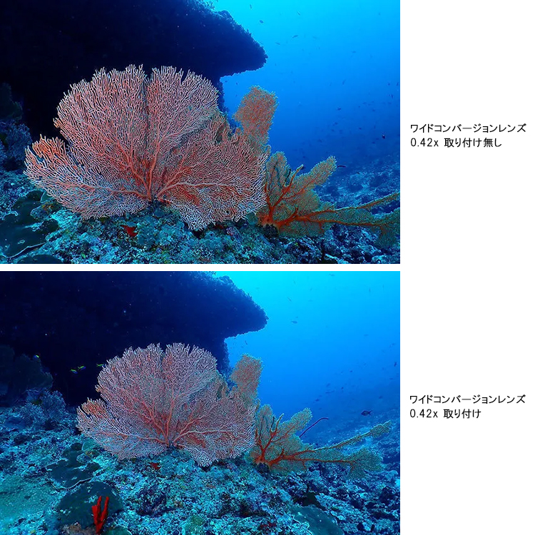 被写体に迫る近接撮影も、遠景の水中景色もピントが外れることはありません。