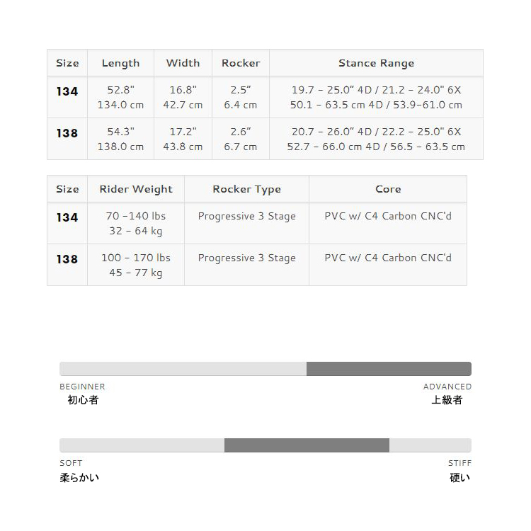 ☆長さ 131cm / 幅 41.6cm / ロッカー 6.0cm / スタンスレンジ 50.8〜61.0cm / 32〜64kg