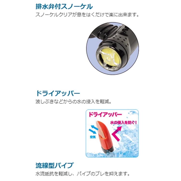 スノーケル内に水が入ってしまっても、息を吹き出す事でスノーケル下部から排水が可能。