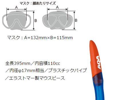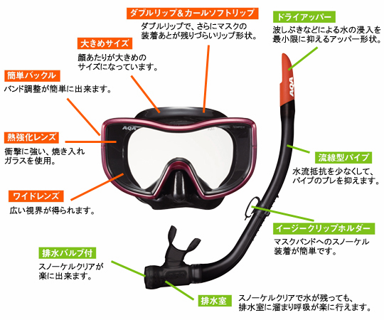 広い視界を持つワイドレンズ1眼マスクと、排水バルブ付きスノーケルの2点セット。男性向けレギュラーサイズ。