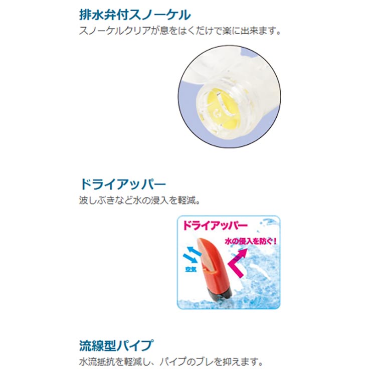 スノーケル内に水が入ってしまっても、息を吹き出す事でスノーケル下部から排水が可能。