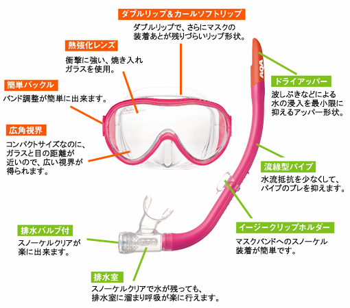 緩やかな曲線が表情をやさしく見せるコンパクト設計の女性向けマスク&スノーケル のセット。