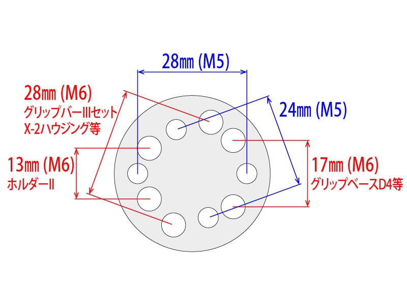 様々なハウジングやグリップに対応するよう、6個のM6取り付け穴と、4個のM5取り付け穴が設けられ、