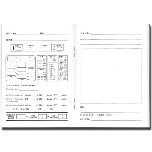 左ページにダイブデータ、右ページにコメントなどを記入するタイプで、22ダイブ分記載できます。