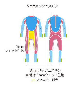 胸や背中は5mmメッシュスキン、お腹から内腿にかけては5mmウェット生地、腕や膝下部分は3mmメッシュスキン、 その他の部分には3mmウェット生地を使用しています。