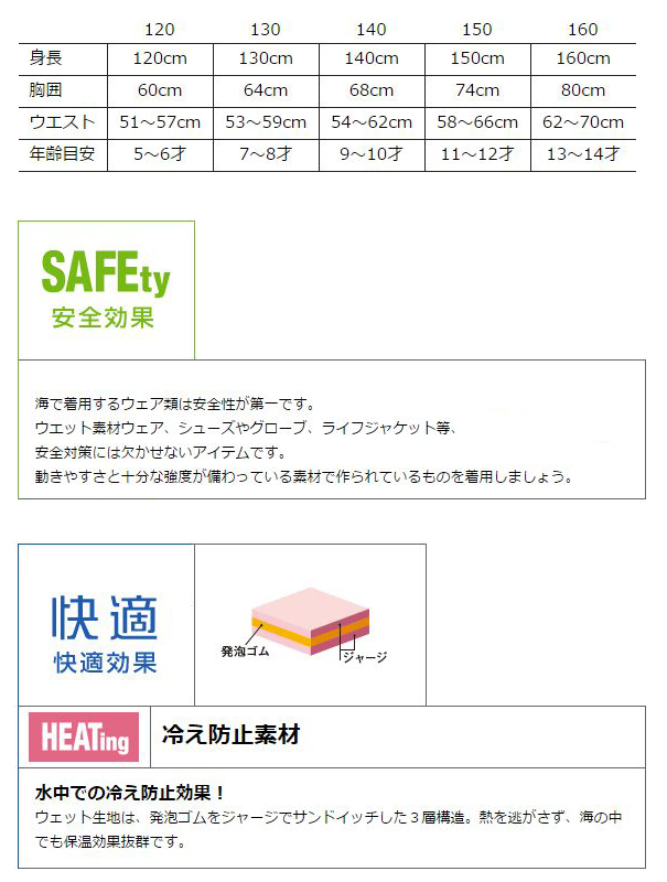 ■130:身長/130cm 、胸囲/64cm 、ウエスト/53〜59cm