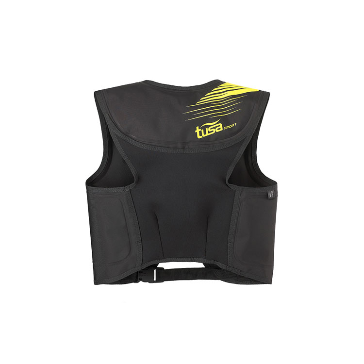 右肩から胸に向けて目立ちやすい黄色のデザインを施し、水中や水面でも見つけやすいようにしています。