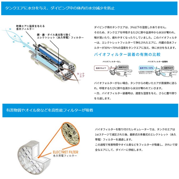 ◆ナイトロックスでの使用:40%以下の酸素分圧で使用可能、ただしエレクトレットフィルターカートリッジは新品を使用