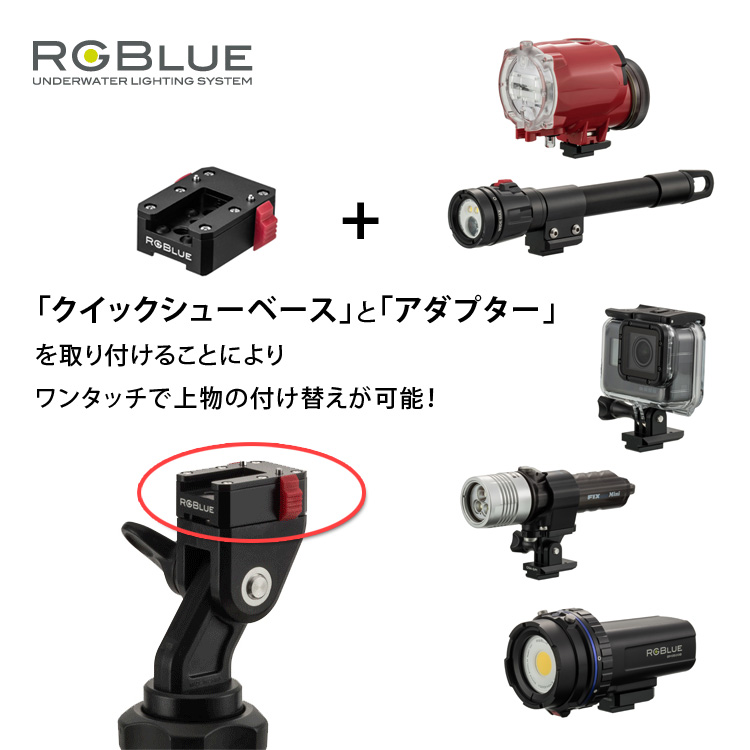 「クイックシューベース」、「クイックシューアダプター(7種)」、「クイックシューベースマウント(2種)」を組合せて使用することにより、定番水中撮影機材メーカーのストロボやライト、ウェアラブルカメラ等を各種アダプター類から瞬時に着脱することが可能になるシステム製品。