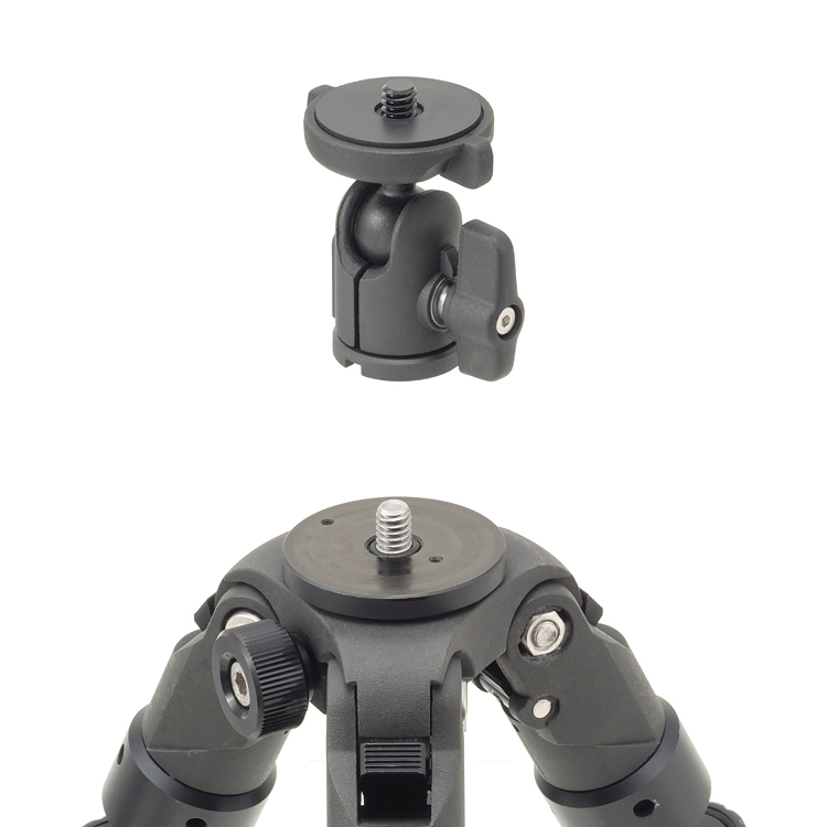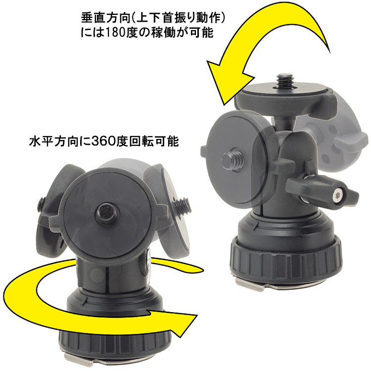 ・自由雲台(ボール雲台)の構造を採用し、コンパクトながら広い可動域を実現!(左右360度、上下180度)