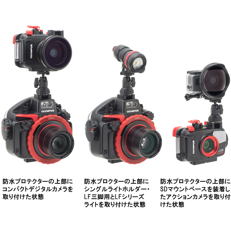・一般的な防水プロテクター等に備わっている「アクセサリーシュー」やINON「シューベーススペーサー」等に 直接取り付けが可能