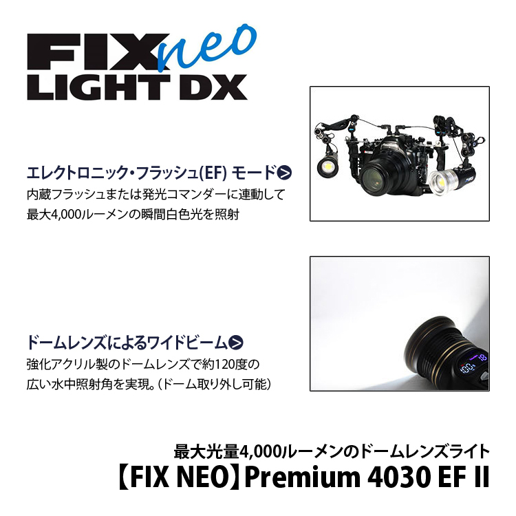 光ファイバーで接続したカメラ/ハウジングの内蔵フラッシュまたは発光コマンダーに連動して、最大4,000ルーメンの瞬間光を照射。光に敏感な生物へ低輝度でアプローチし、ストロボを使用することなくそのままマクロ撮影が可能。(満充電で約3,500回のEF照射)ドームレンズによるワイドビーム