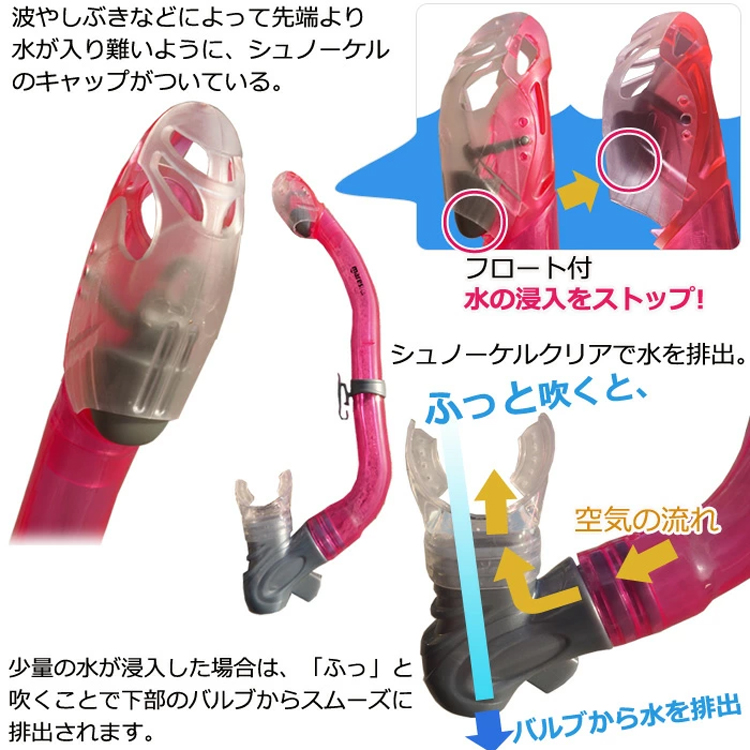 スノーケルは水がほとんど入らないドライトップ機能付き。