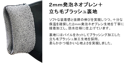 ソフトな装着感と抜群の伸びを実現しつつ、十分な保温を確保した2mm発泡ネオプレン生地を 丁寧に接着加工し、防水仕様に仕上げています。