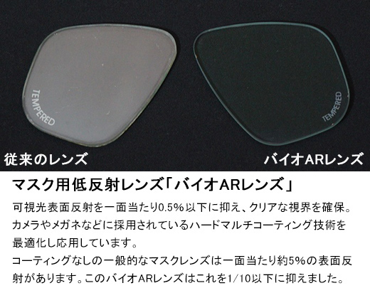 バイオメタルマスクproでは、ステンレス製フレームの採用による適度な重量が、内容積の浮力を効果的に打ち消し、 その結果水中での装着感が陸上とは全く異なる無重量感覚となって感じられます。