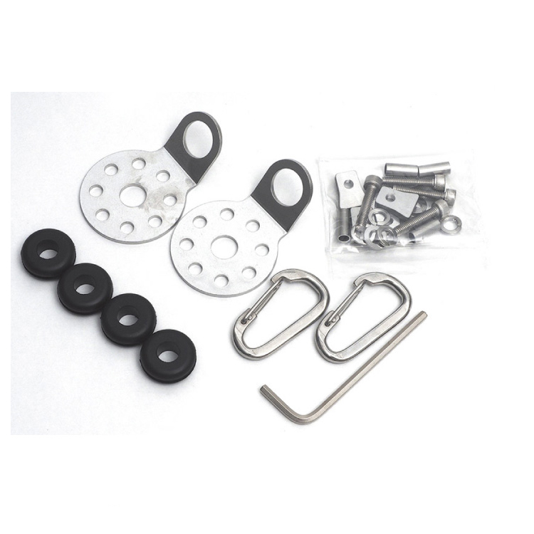 フロートアームハンドルをハンドルとして使用する為の取付金具セットです。金属同士の接触によるノイズを抑える為のグロメットを付属しています。