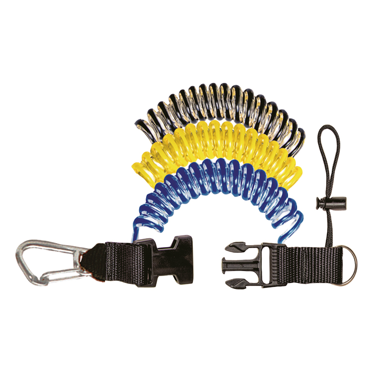 BCジャケットのDリングに引っ掛ける事でカメラや水中ライト、スレートなど様々なアイテムを携帯する事が出来ます。使用する時はカラビナはDリングに掛けたまま、バックルを外せばコイルが伸びて手元で使用でき、使用しない時は バックルをはめれば不要にブラブラせずコンパクトに携帯させる事が出来便利です!