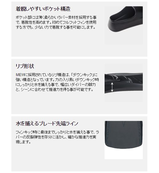 ◆Mサイズ:素足25-26cm/ブーツ24-25cm/全長550mm/フィン先幅200mm/重量750g