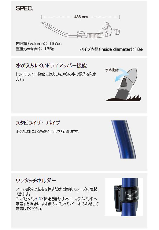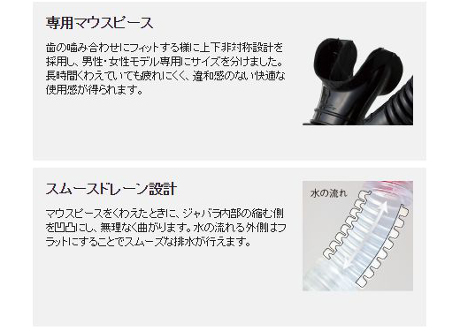 スノーケル内に入った水を簡単に排水出来る排水弁を装備したシンプルなスタンダードタイプのスノーケル。スノーケルトップにはスノーケル内に水を入り難くするドライアッパーを装備。