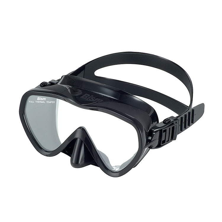 レンズをシリコーンで直接包み込んだBismのフレームレスダイビング用1眼マスク。軽量で広い視野を確保します。