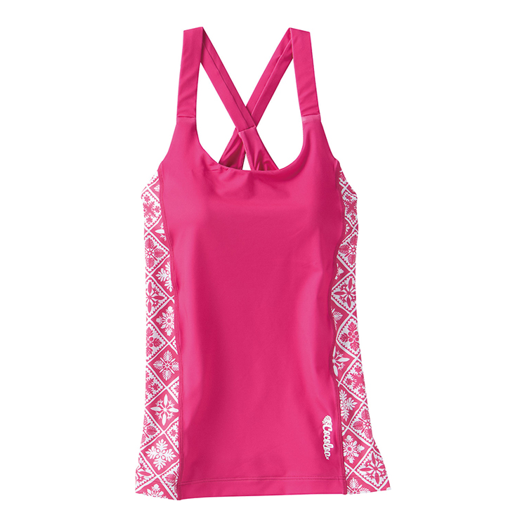 背中のクロスが可愛いブラカップ付きのトップス。