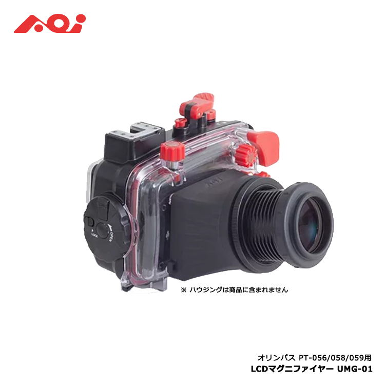 AOI(エーオーアイ)UMG-01マグニファイヤーは、オリンパス TGシリーズ純正防水プロテクター(PT-056,PT-058,PT-059)液晶画面用のマグニファイヤー。水中倍率は約2.3倍、液晶画面をカバーで覆うため、明るい水中でも画面が観やすくなります。そして「視度補正」を水中で、しかもレンズ廻すだけでできるのがとても便利。シニアダイバーの方は特に目の調子がダイブ前半と後半で変化しても、そのつど視度補正が出来るので必需品です。