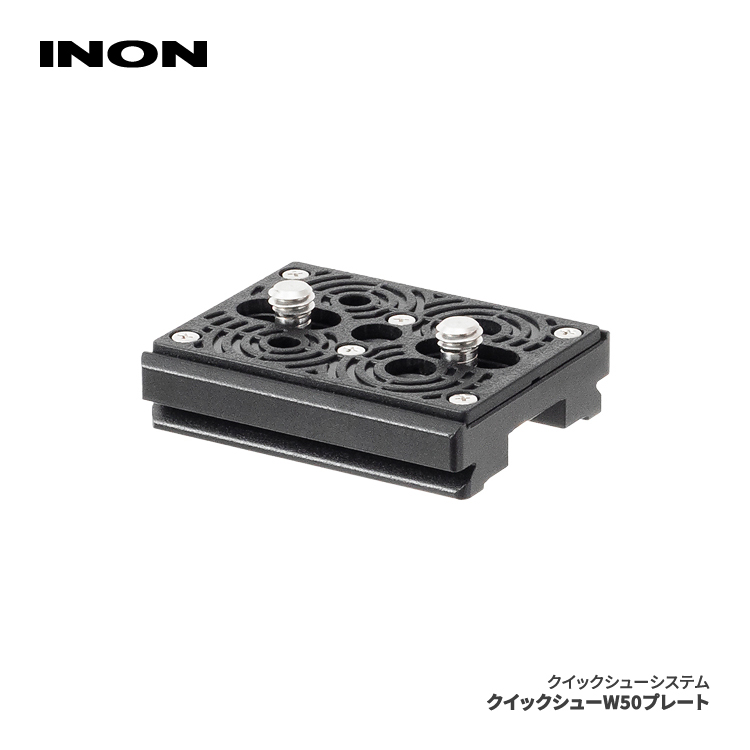 イノン独自のアルカスイス規格マウントを採用した、ハウジングと「グリップベースD5」、「水中3ウェイ雲台」を接続するクイックシュー。強固な接続と瞬時の分離を両立。