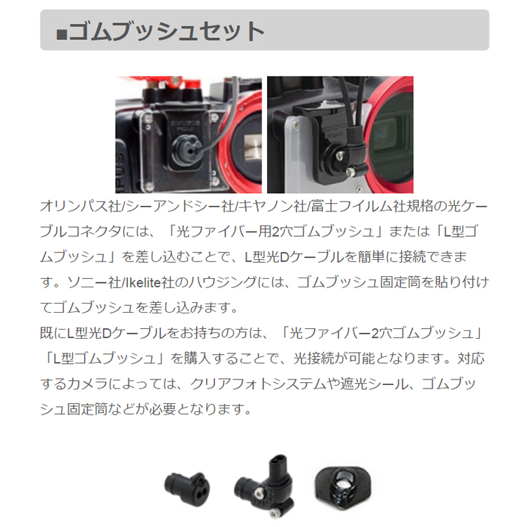 オリンパス社/シーアンドシー社規格の光ケーブルコネクタを装備したハウジングに、L型光Dケーブルを装着可能とする「光ケーブル用2穴ゴムブッシュ」が付属するセットです。出荷状態で「L型コネクタ」を装着した仕様となっており、従来の「2穴ゴムブッシュ」も継続して付属。