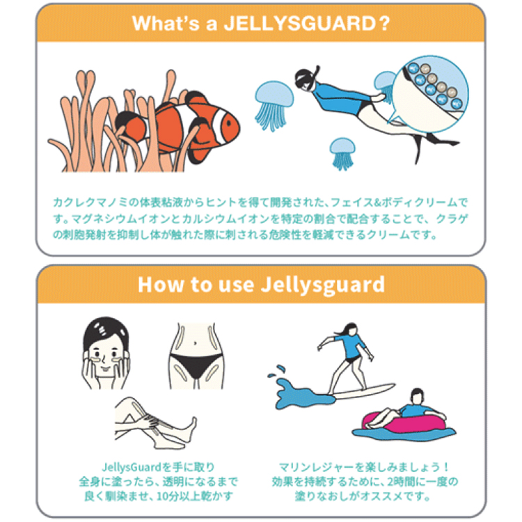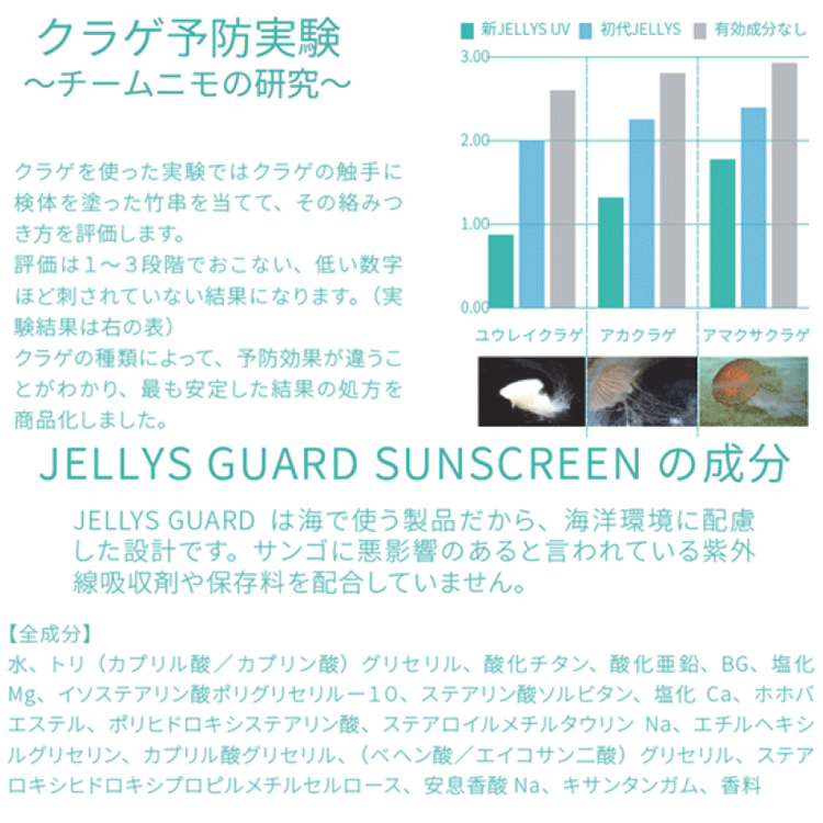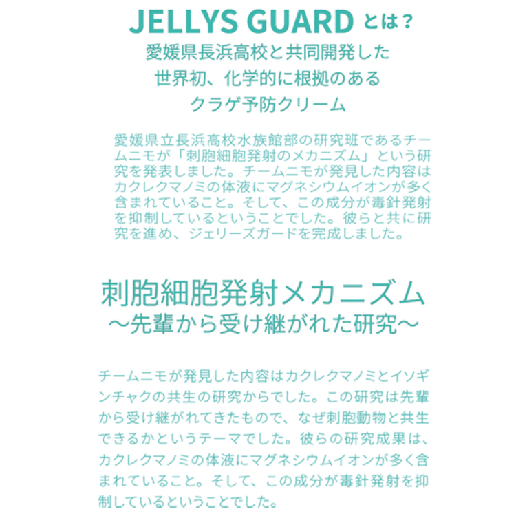 海水浴やサーフィンなどマリンレジャーなどで、乾燥した肌を守るために独自の配合で作られた、ヒアルロン酸配合のクラゲ予防フェイス&ボディークリーム愛媛県立 長浜高校 水族館部の研究班である「チームニモ」の刺胞動物 (イソギンチャク類・クラゲ類) の生態を解明した研究をもとに、処方を共同開発。