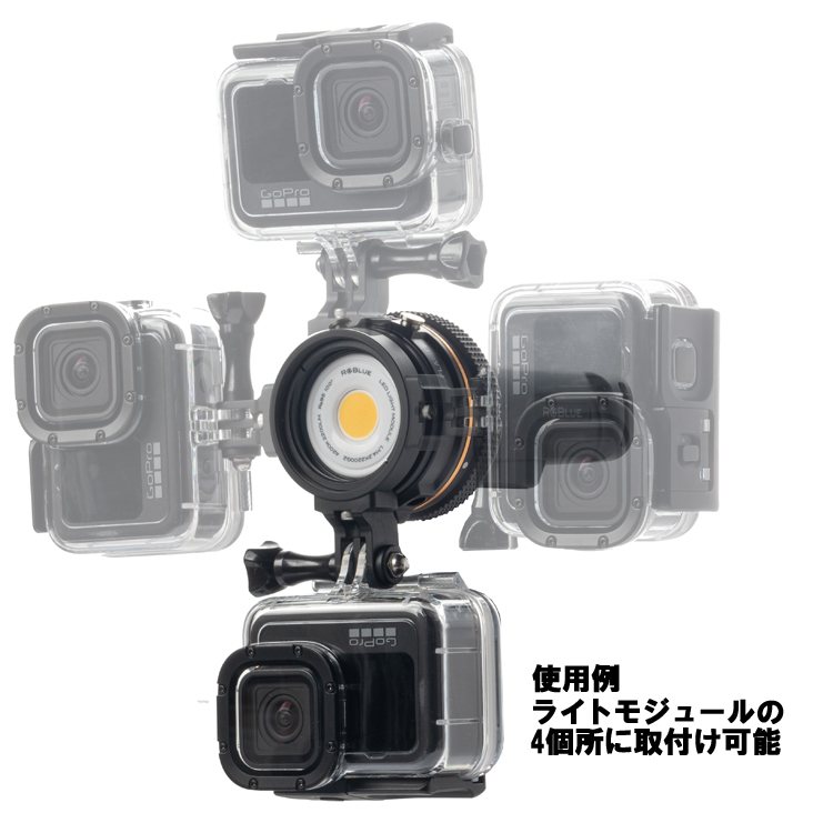 ライトに直接GoPro を取付けるためのアダプター。 ライトモジュールのアクセサリー固定ネジ穴に直接取付けます。 固定位置は4 か所から選択可能です。ハンドグリップとの併用で、コンパクトな撮影キットが可能です。※ライトモジュールへの取付けには六角レンチ(二面幅:2.5mm)が必要です。