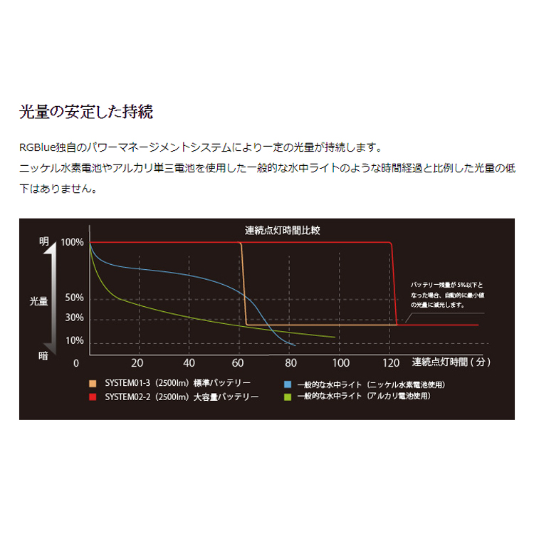 ※レッド(残量5%)になると自動的に600lmに固定され1時間点灯します