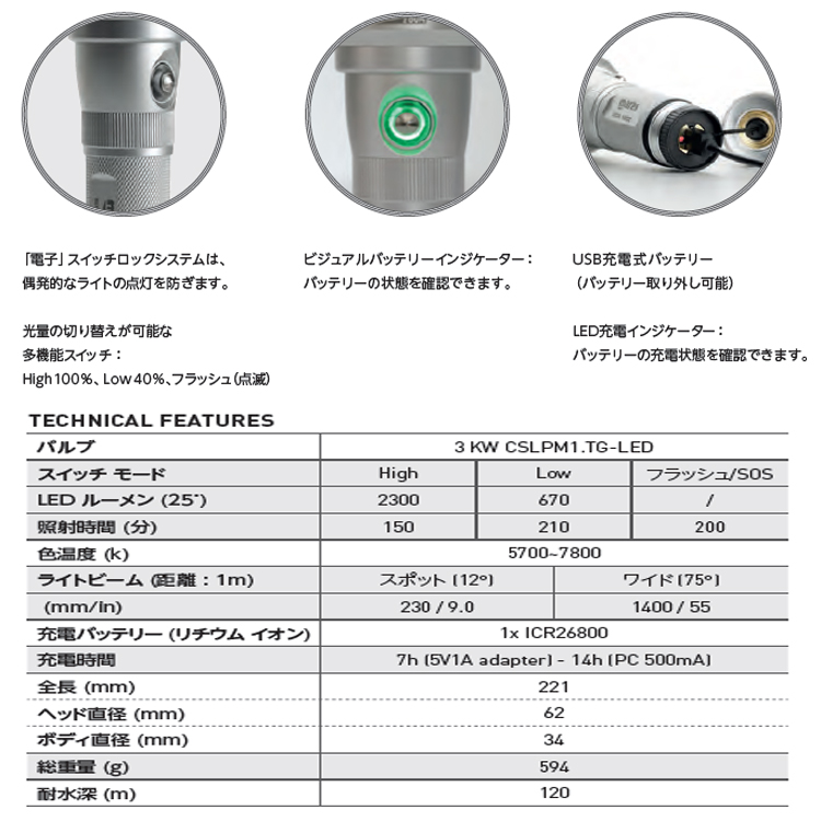 ◆トーチの誤動作を防ぐ「電池ロック」システムスイッチをダブルクリックしてトーチをオンにします。