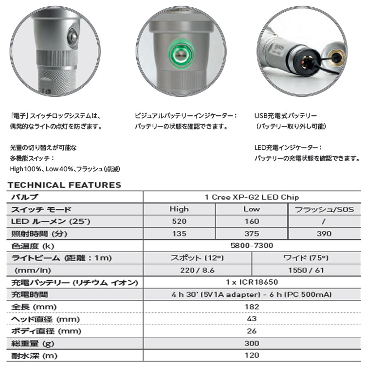◆トーチの誤動作を防ぐ「電池ロック」システムスイッチをダブルクリックしてトーチをオンにします。