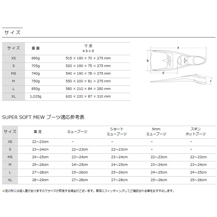 ◆Mサイズ:素足25-26cm/ブーツ24-25cm/全長550mm/フィン先幅200mm/重量750g
