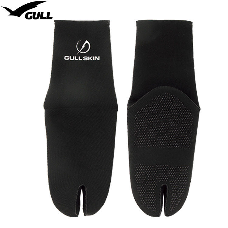 スキンダイビング、フリーダイビング用品GULLSKINのカーボンフィン着用時のフィンずれを防止する1.5mm足袋型ソックスフィンずれや、サイズの調整だけの利用ではなく、ビーチサンダルを履いたまま使用できるよう先割れ形にし、足首まで保温できる機能的なアイテム。