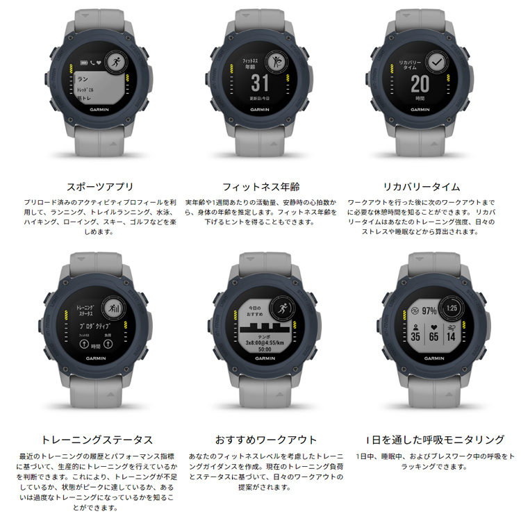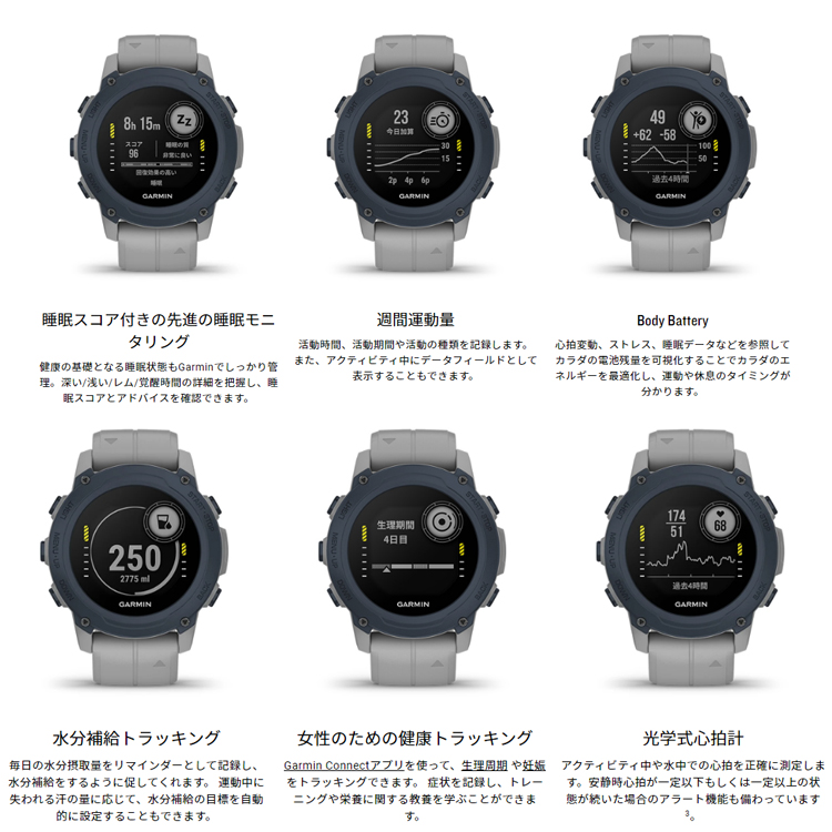 ◆スマート機能:通知機能、ライフログ機能(ステップ数、上昇階数、睡眠モニタリング、消費カロリー、ストレス計測、Body Batteryなど)