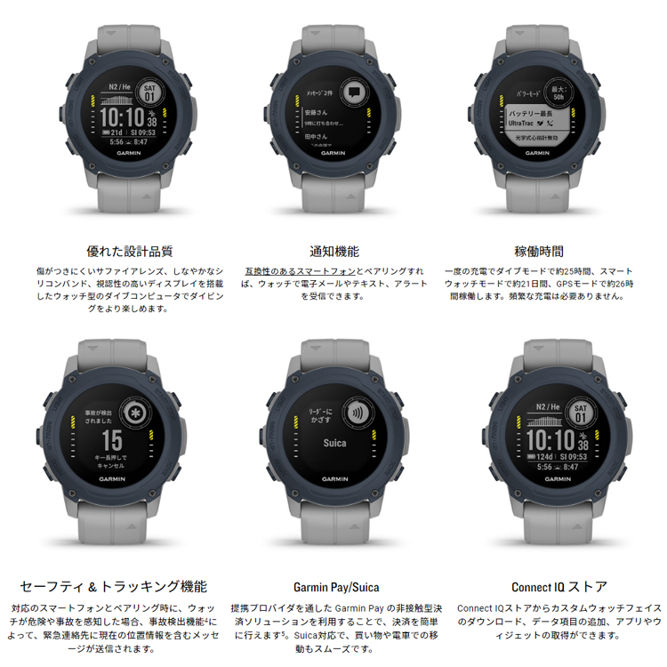 ◆対応アプリ:Garmin Dive、Garmin Connect / Garmin Connect Mobile、GarminExplore、Connect IQ