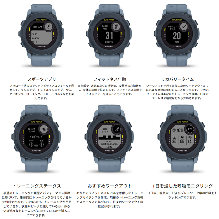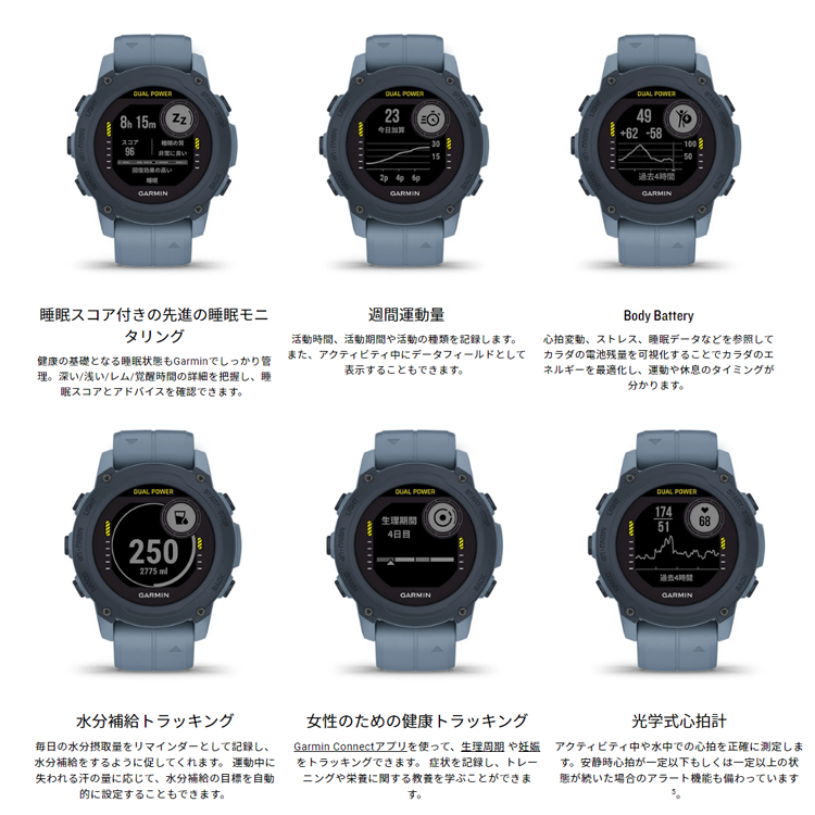 ◆スマート機能:通知機能、ライフログ機能(ステップ数、上昇階数、睡眠モニタリング、消費カロリー、ストレス計測、Body Batteryなど)