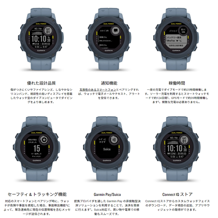 ◆対応アプリ:Garmin Dive、Garmin Connect / Garmin Connect Mobile、GarminExplore、Connect IQ