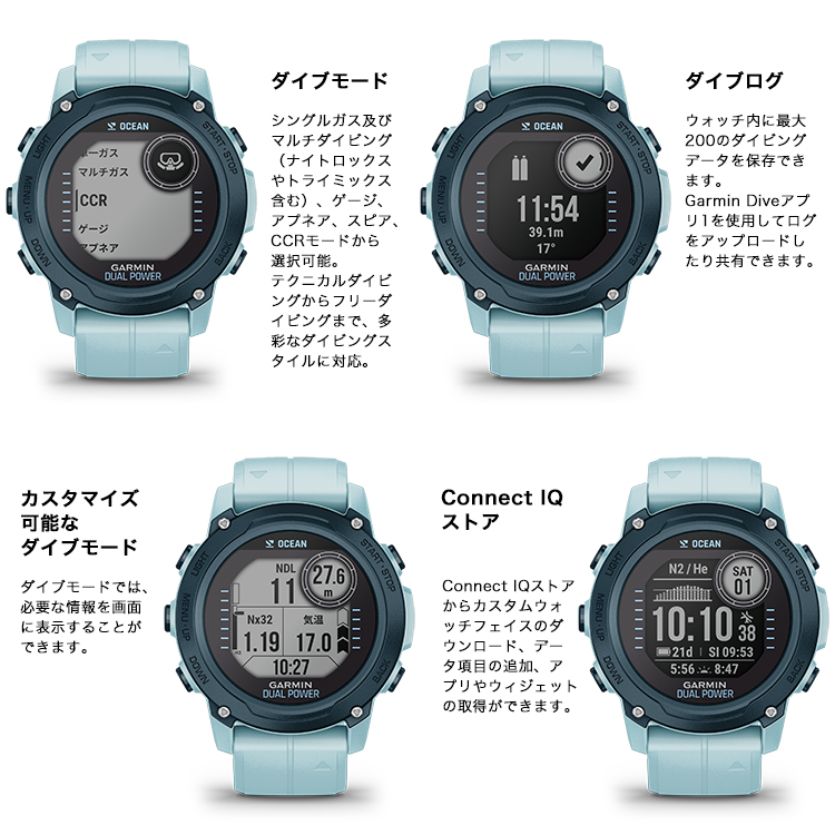 ◆対応アプリ:Garmin Dive、Garmin Connect / Garmin Connect Mobile、GarminExplore、Connect IQ