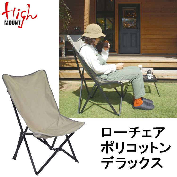 コットンなのに包み込まれるようなホールド感でゆったり座れる丈夫なポリコットン素材の折り畳みローチェア。大き目のサイズでホールド感がアップしたデラックスモデル。