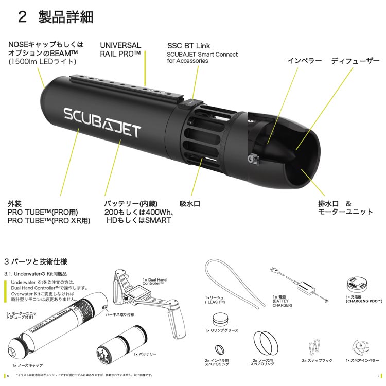 同梱品: SMART BATTERY™ 200Wh(機内持ち込み可能)、モーターユニット、チューブ、 ダイブコントローラー デュアルハンド、 充電器、ダイブリーシュ、スペアインペラ、Oリングセット、Oリンググリース、六角レンチを含む